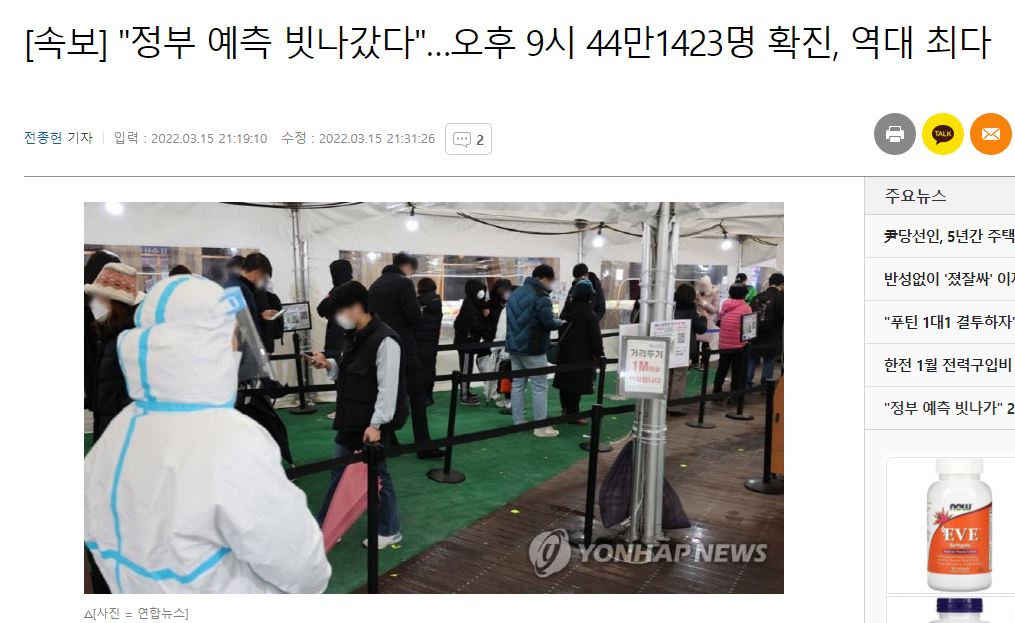 정부의 예측이 빗나갔다는 속보가 들어왔습니다. 금일 오후 9시까지 코로나19 확진자가 44만명을 넘어선 것입니다. 역대 최다를 다시 기록하고 있습니다. 집계를 마감하는 자정까지 시간이 남은 만큼 16일에 발표될 신규 확진자는 이보다 더 늘어나것으로 예상이 됩니다. 곧 정점이라고 예측했던 전문가들의 말이 조금은 빗나간 것이 아닌가라는 생각이 듭니다. 앞서 정부 당국은 오미크론 확산세가 이어지다가 오는 23일을 기점으로 유행이 꺾일 것으로 예상한 바 있다. 유행 정점은 16일부터 22일 사이로, 이때 일 최고 37만명의 확진자가 발생할 것으로 봤었습니다.